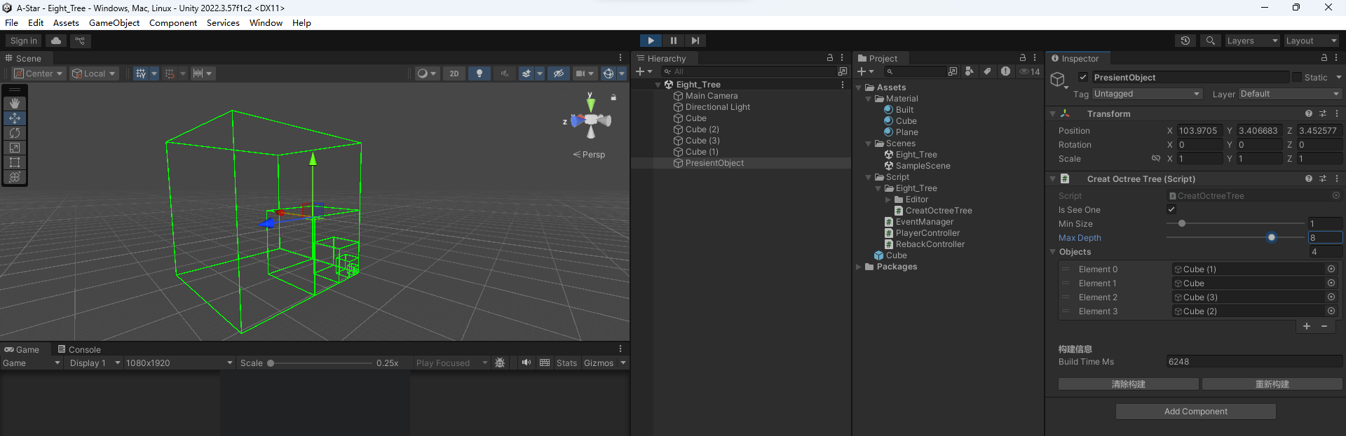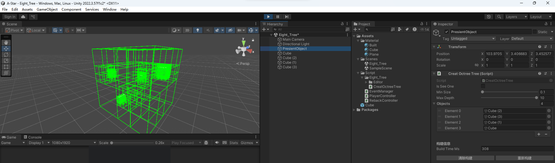 }为了方便在Unity中使用,我们创建一个继承了 MonoBehaviour 的类 CreatOctreeTree,并将它挂在一个边长为8的Cube上: